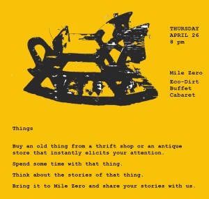 A research-creation event exploring storytelling as a trope to confer value upon things we use on a daily basis to minimize consumerism. Storytelling, thus, becomes a site of ecological resistance.